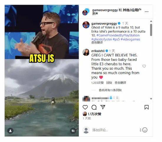 距离游戏发售还有数日,知名脱口秀博主@gameovergreggy日前在Instagram发文,对饰演游戏主角“笃”的演员Erika Ishii进行了评价,认为Erika Ishii的演技可以说是10分满分。对此,Erika Ishii非常激动的回应道:“我简直不敢相信!能得到你这样的认可,对我而言意义非凡。”在评论区里,更多玩家对Erika Ishii进行了盛赞。